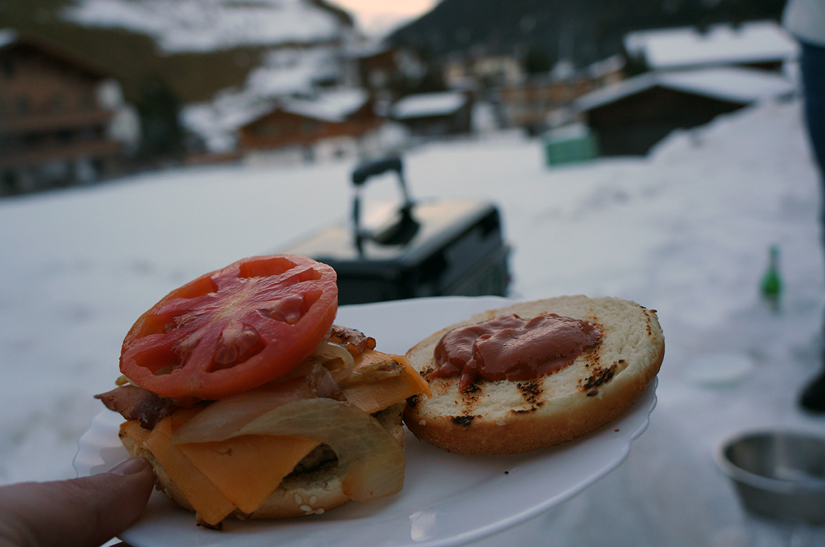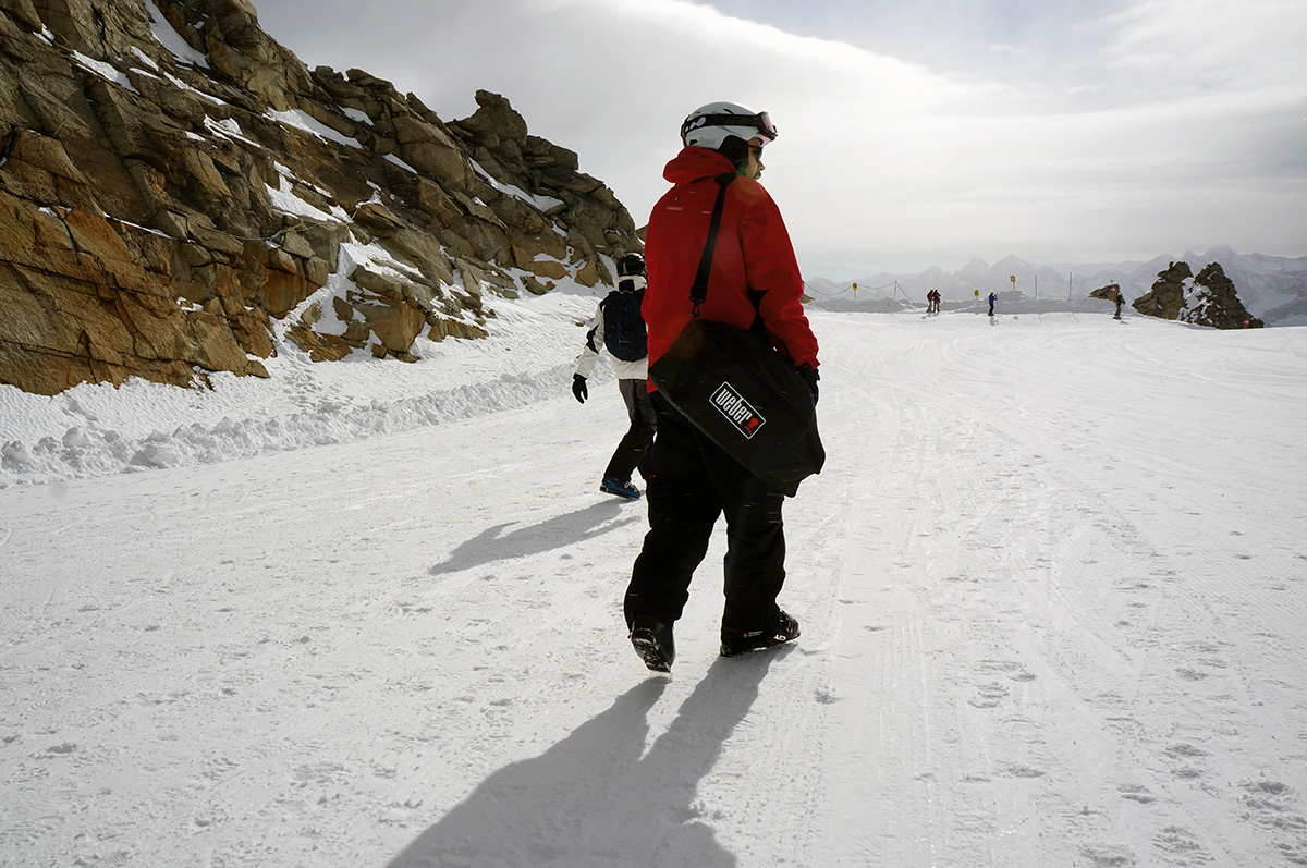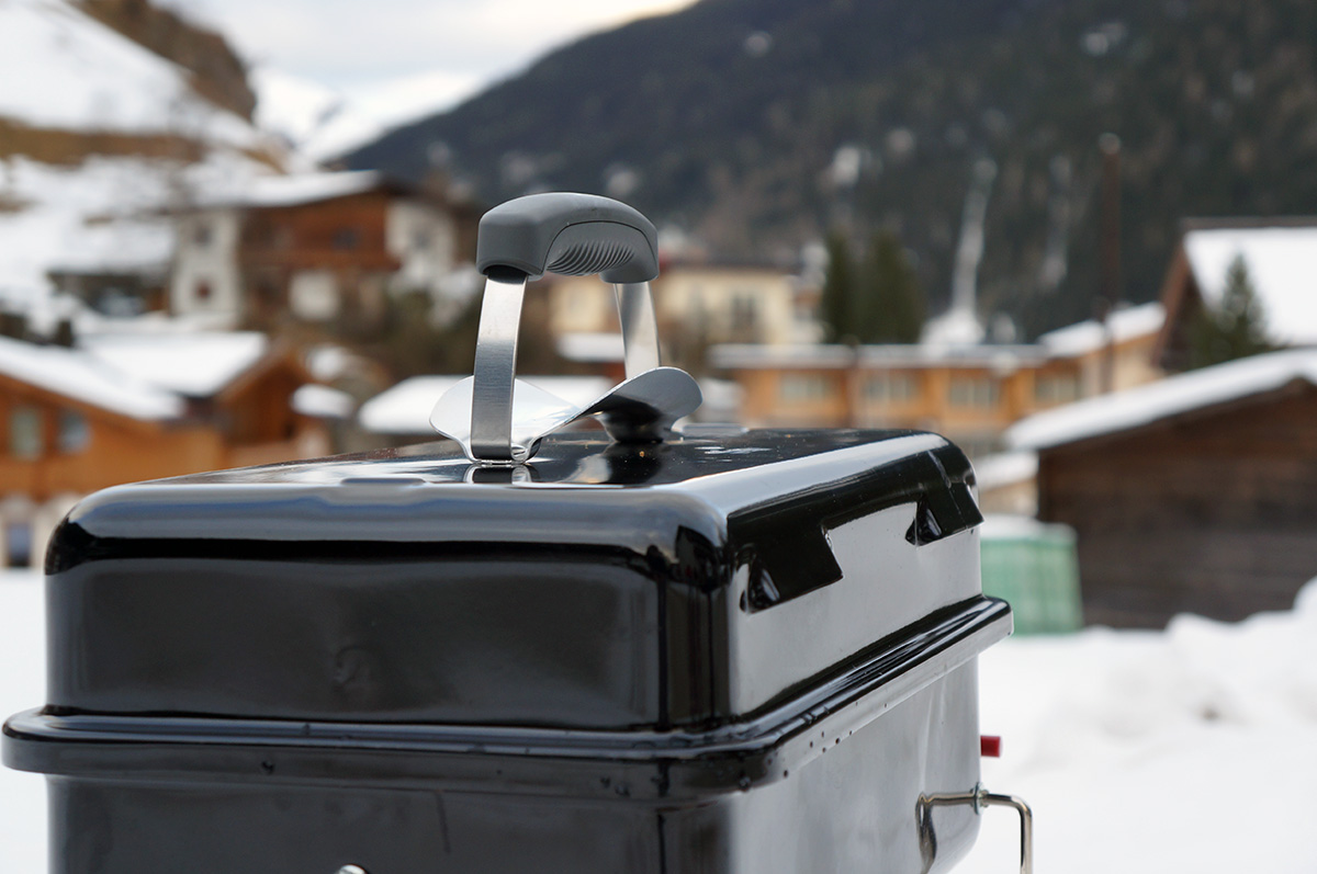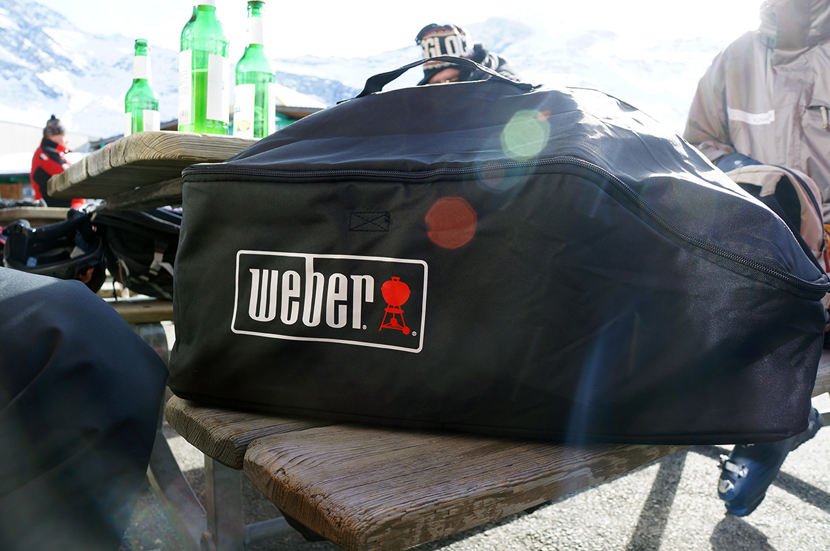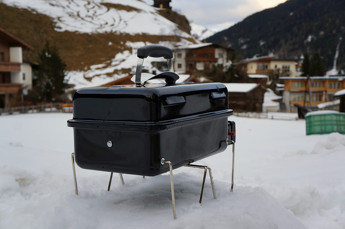 Um die Leistung und Effektivität des Weber-Go Anywhere auch beurteilen zu können, hab ich ihn prompt beim letzten Snowboardurlaub mitgenommen. Praktischerweise kann man diesen Grill in einer extra erhältlichen Tasche packen, sodass er wie ein normales Gepäckstück fungiert. Zange, Gasflasche und Co. passen ebenfalls dort hinein. Also alles eingepackt und mitgenommen – der Gletscher wartete auf ein heißes Experiment.