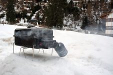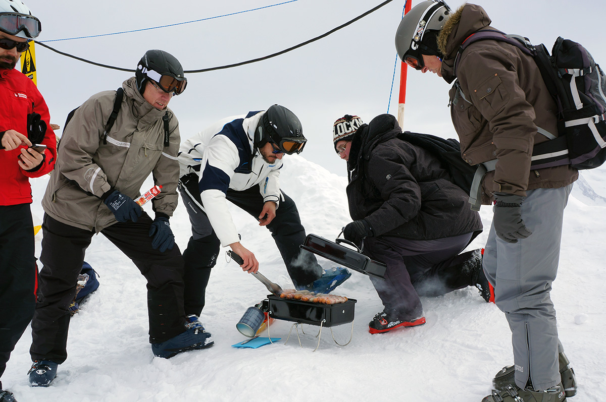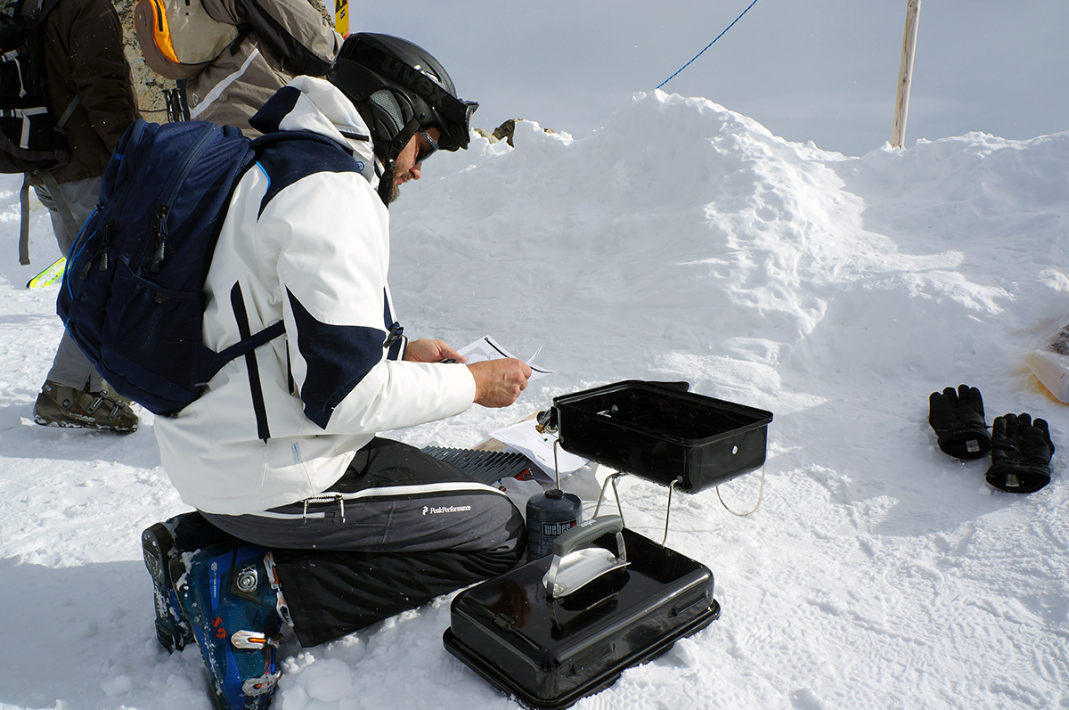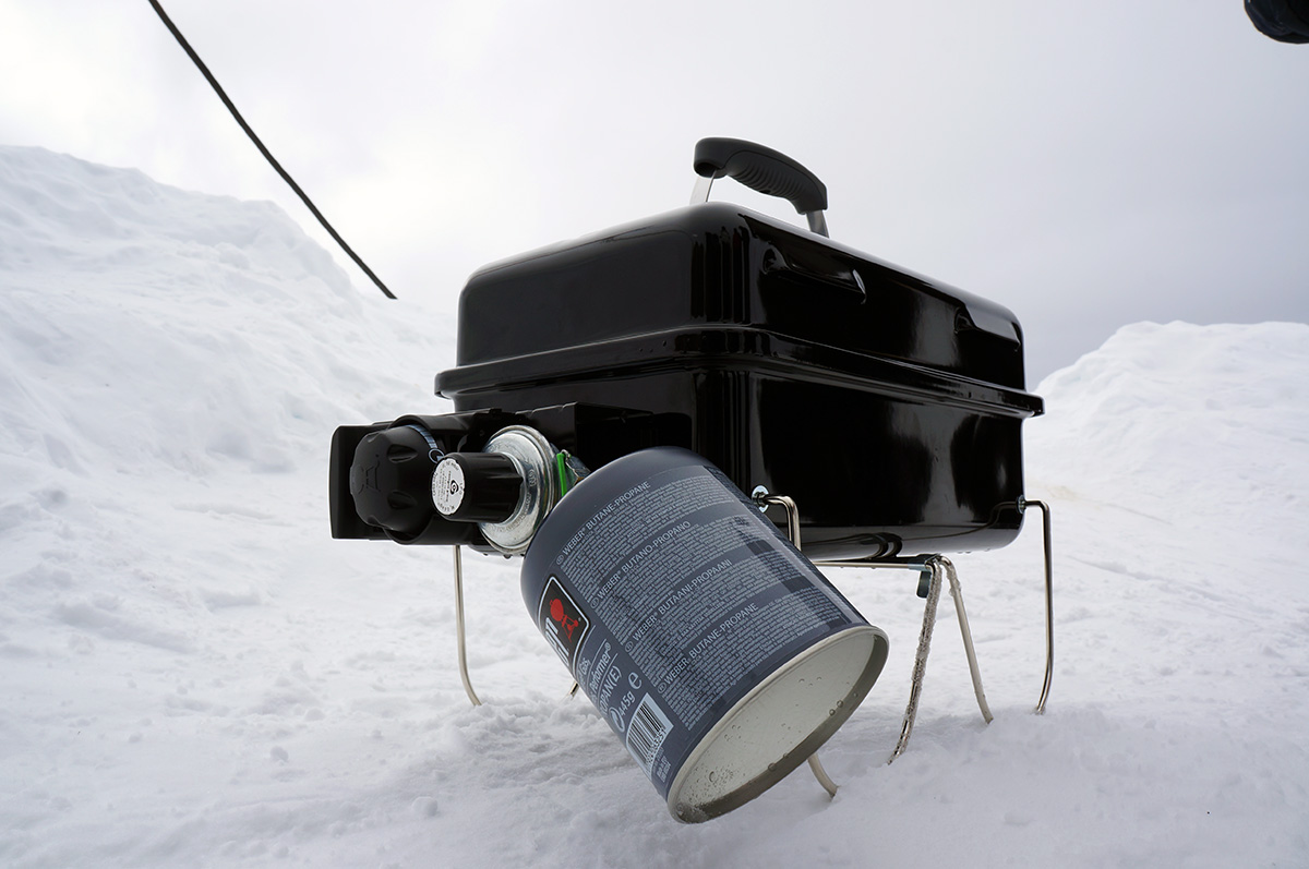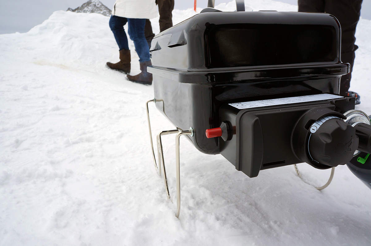 Um die Leistung und Effektivität des Weber-Go Anywhere auch beurteilen zu können, hab ich ihn prompt beim letzten Snowboardurlaub mitgenommen. Praktischerweise kann man diesen Grill in einer extra erhältlichen Tasche packen, sodass er wie ein normales Gepäckstück fungiert. Zange, Gasflasche und Co. passen ebenfalls dort hinein. Also alles eingepackt und mitgenommen – der Gletscher wartete auf ein heißes Experiment.